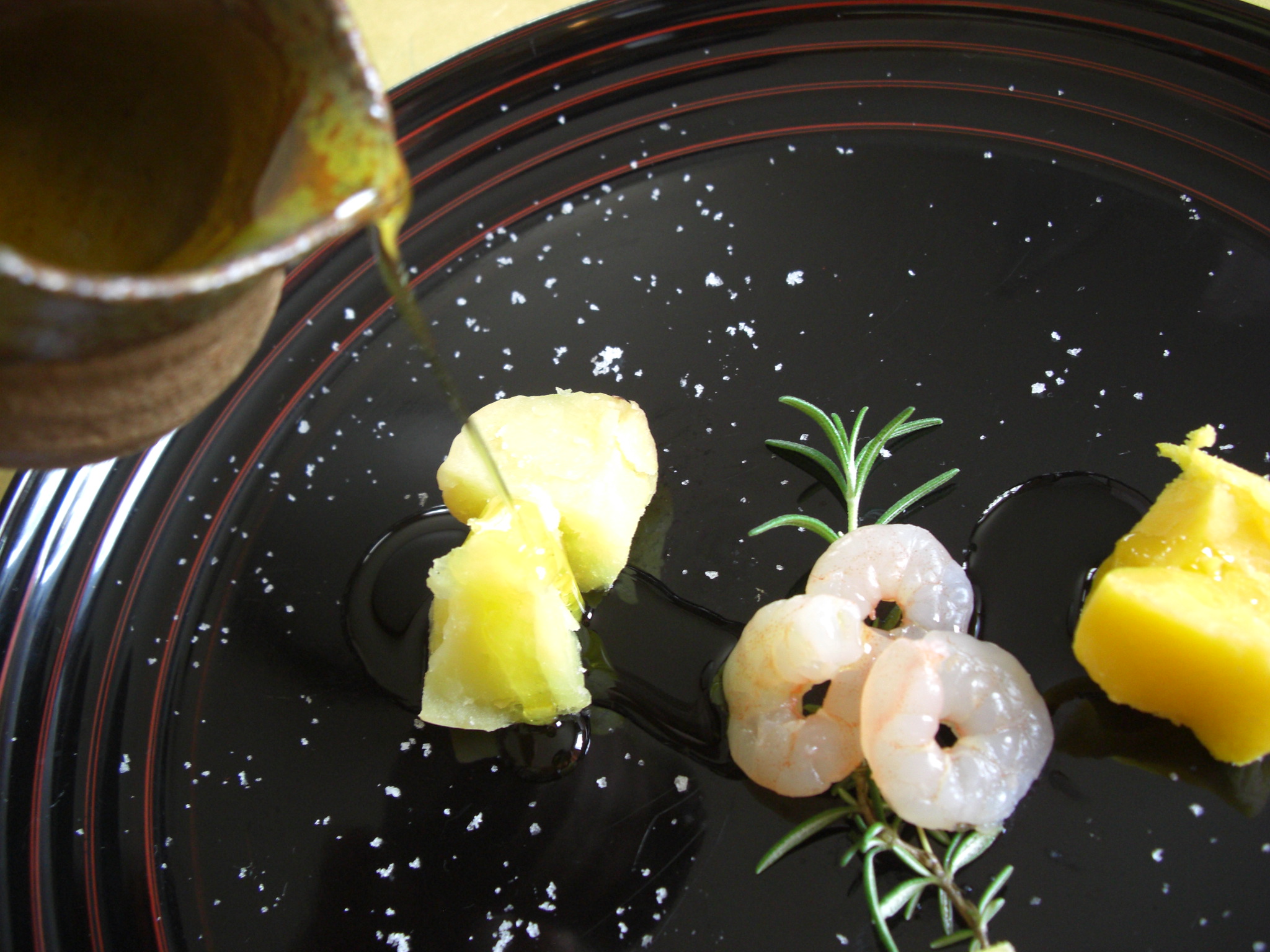 三種類のジャガイモを、エビの回りに盛り付ける。