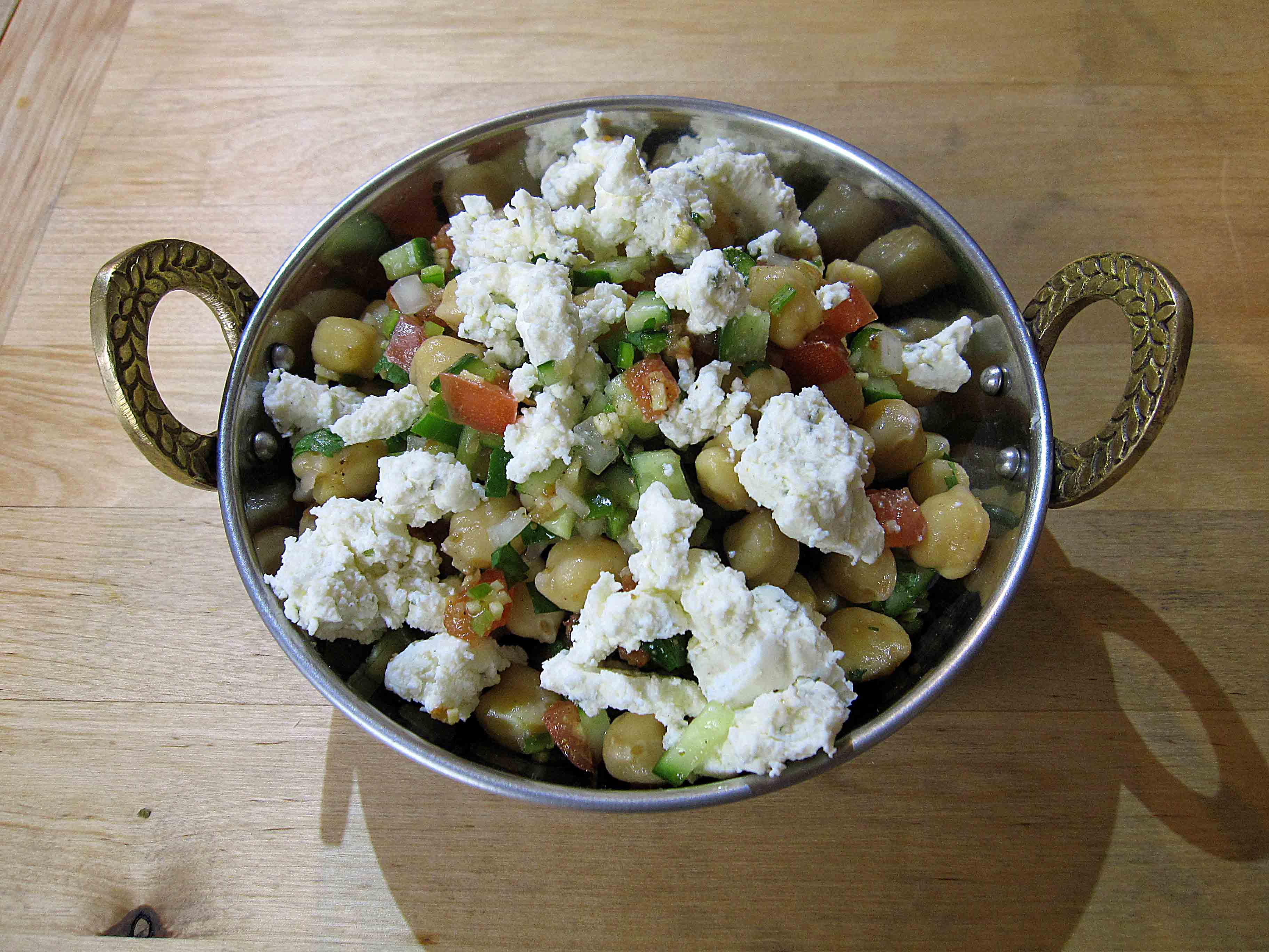 インドでチャットと呼ばれる豆と野菜のノンオイルサラダに、ブルサンクリームチーズをトッピングしました。