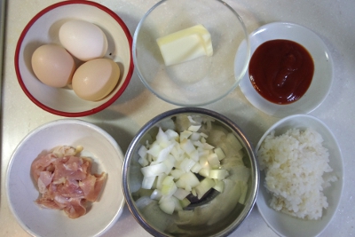 - (4)出来上がったケチャップライスを取り出して、先に皿に盛っておく。