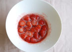 ヘタをとったイチゴとグラニュー糖を、耐熱用の大きめのボウルに入れてよく混ぜる