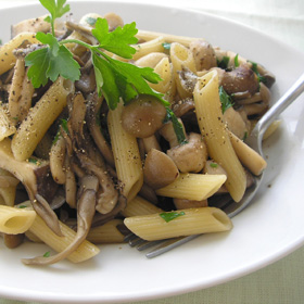 粗く刻んだアンチョビときのこ類を(3)のフライパンに入れて軽く炒め、ペンネの茹で汁も大さじ3ほど加えきのこに火を通す
