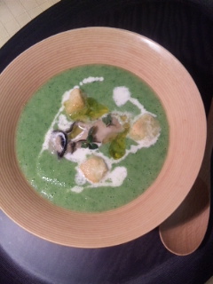 蕪のポタージュを器に入れ牡蠣、クルトン、好みで生クリームをかける