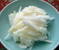 数の子1腹は、飾り用にスライス、他はすりおろし用の蕪と合わせ、フードプロセッサーにかけるか、みじん切りにする。