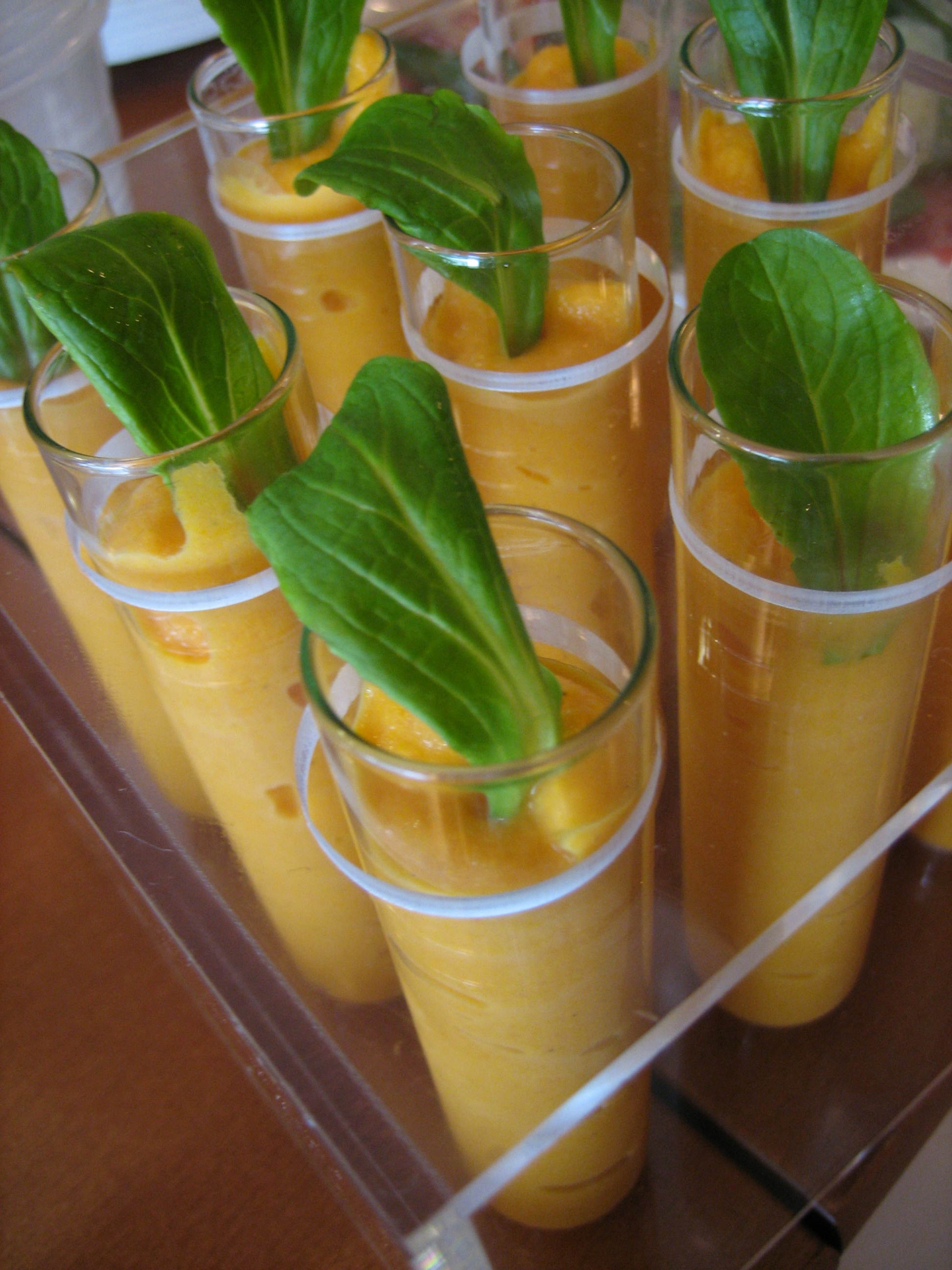 - ゼラチンは分量外の水に溶かしてから加え、ミキサーを少し回すとだまになりません。トロンとする分量は1.3%前後。魚介類とあわせるジュレは魚介類から水分が出るため、少し大目に加えます。