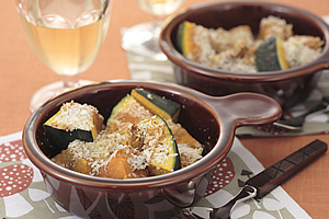 バターを薄く塗ったグラタン皿に1のかぼちゃを乗せ、塩、こしょう、ガーリックパウダーをふる。