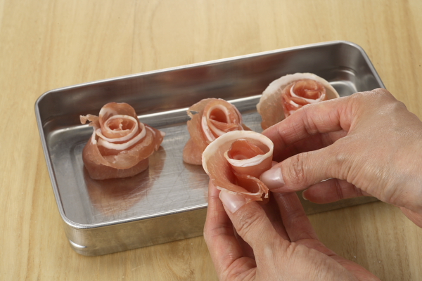 - 今回はホタテ貝柱とブラックオリーブをトッピングしましたが、生ハムやスモークサーモンで作ったバラなどを乗せてもキレイです。