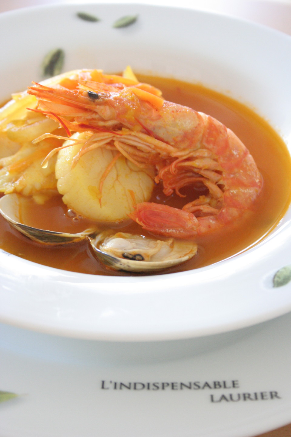 ③に水 サフラン トマトピューレ はまぐりのスープを加えひと煮たちしたら、新巻鮭 有頭海老 ほたて貝柱を入れ10分弱火で煮込みます。