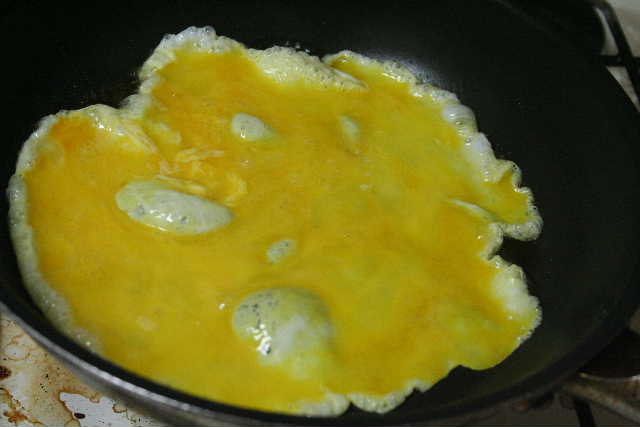 フライパンにごま油の半量を高温で熱し、割りほぐして少し塩をした卵を一気に入れて大きく混ぜる。