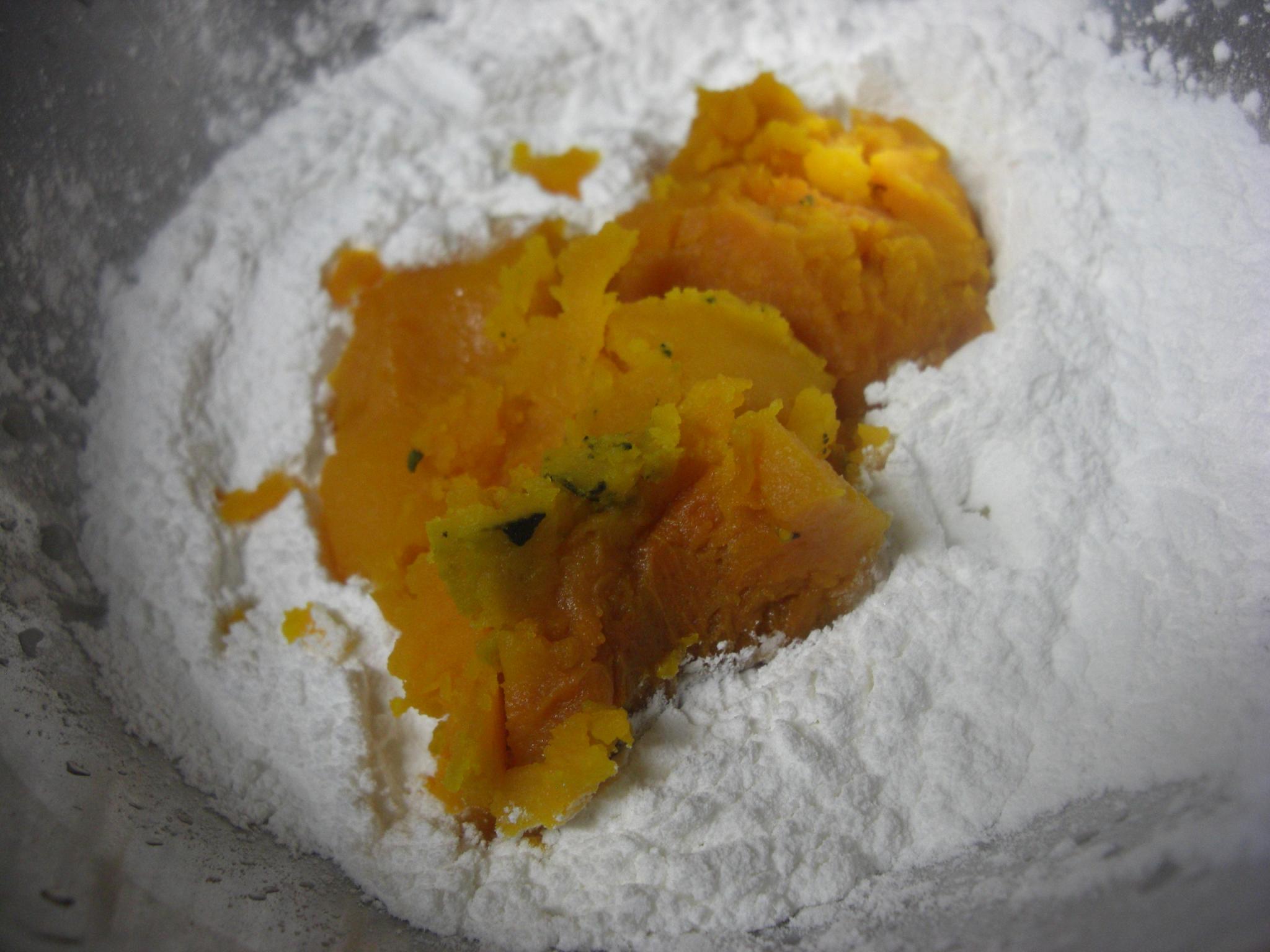 ボールに 白玉粉、かぼちゃを入れ良く混ぜる。(ポイント①参照)