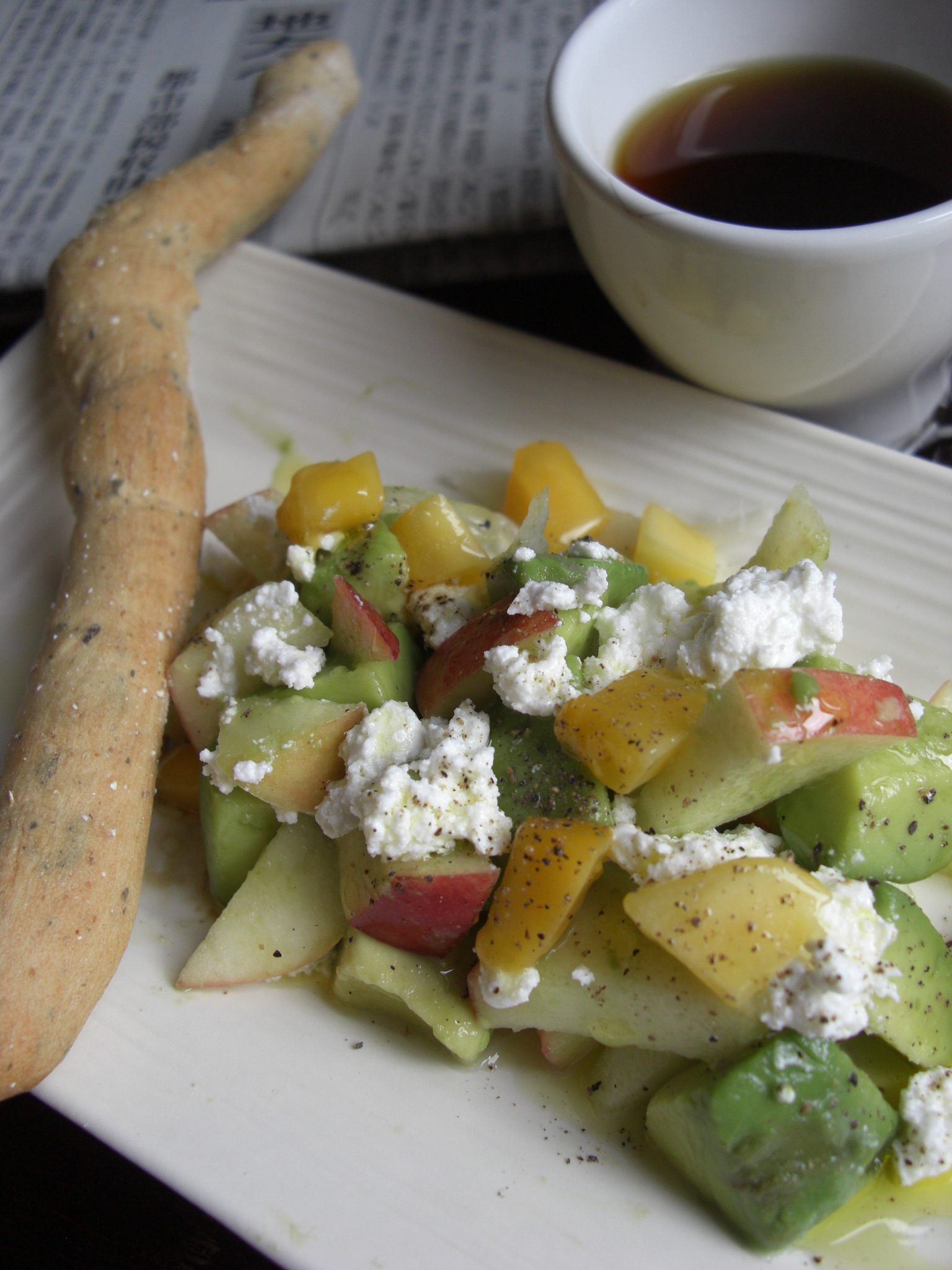 - アボガドは、皮が黒っぽい色の物を使いましょう。 中身はネットリしています。そのネットリがアボガドの美味しさです。 切った後は変色しやすいので、林檎酢はすぐに加えてくださいね。