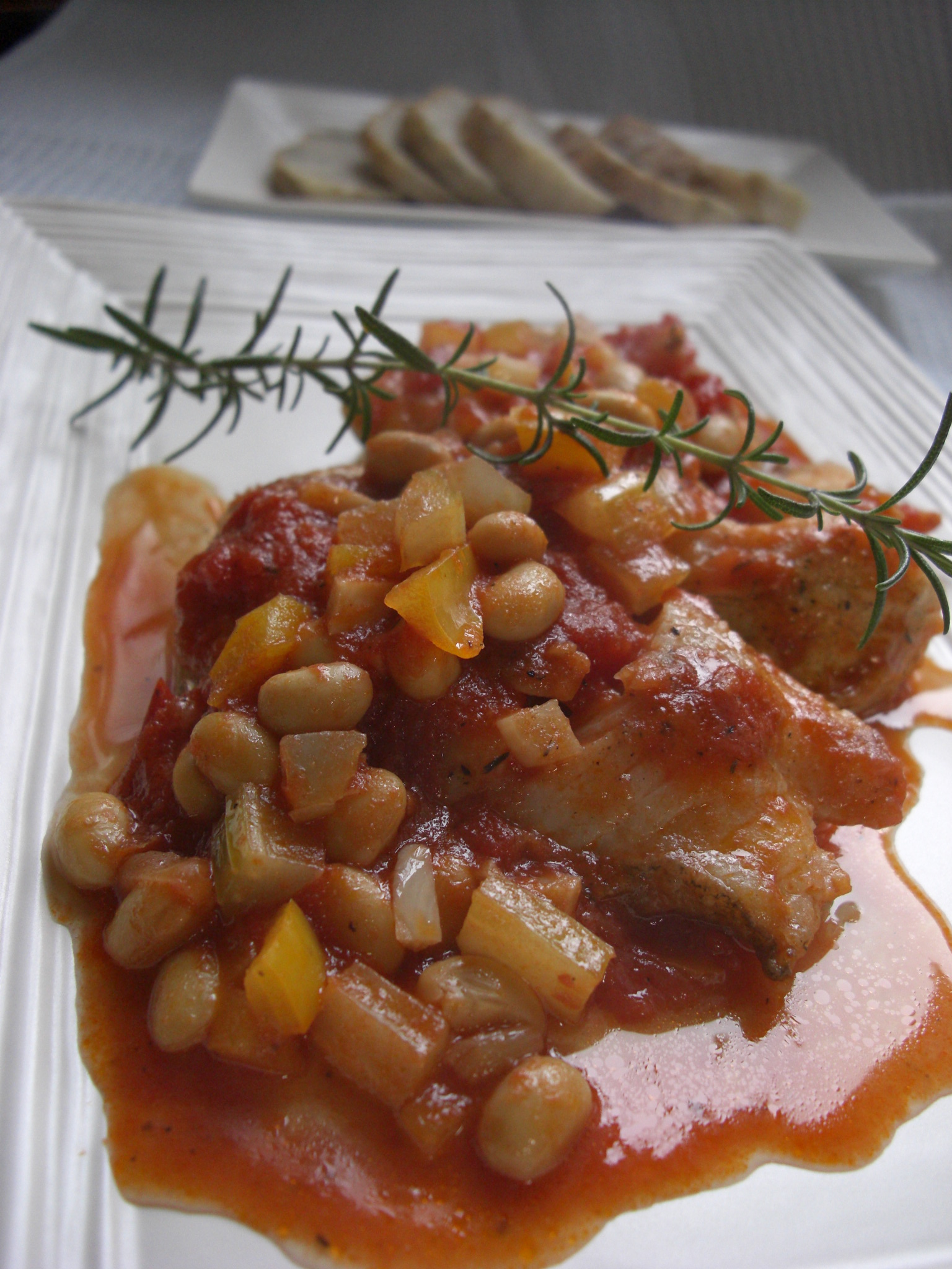 ④にトマトソース(ポイント②)、白ワインを加え、鱈を入れ、塩、胡椒で味を整え、鱈に火が通ったら出来上がり。