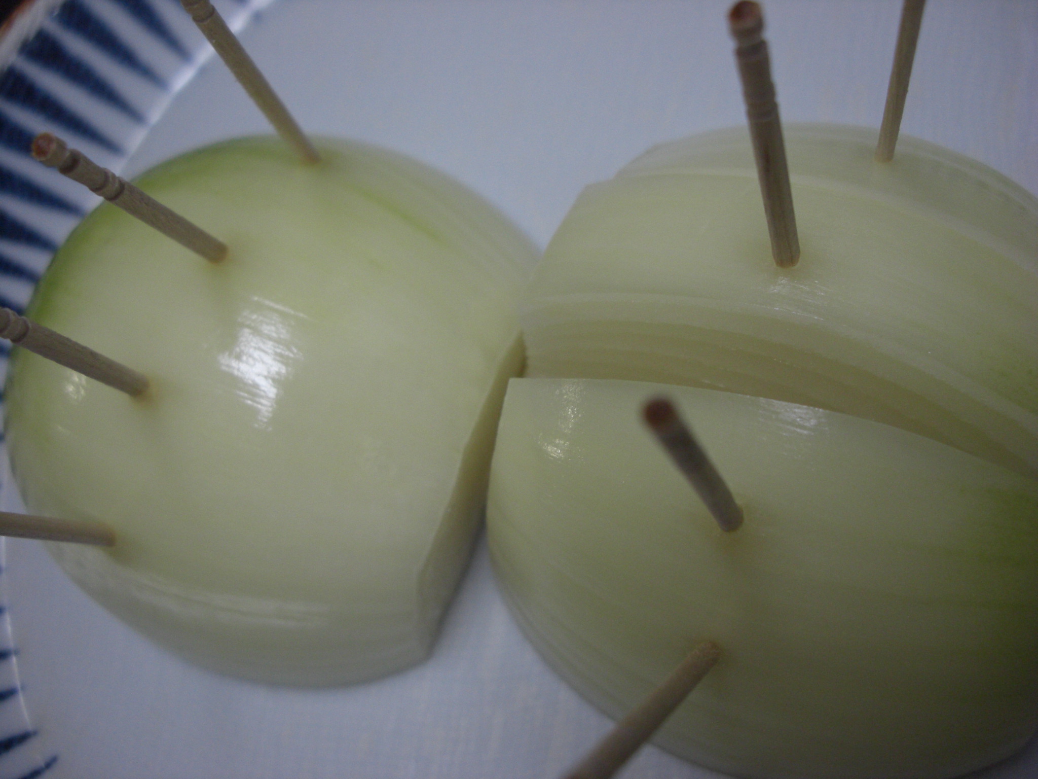 - 爪楊枝を刺してから、くし型に切りましょう。玉ねぎがバラバラになりません。