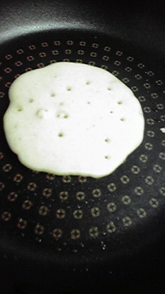 フライパンを熱し、サラダ油を少々なじませたら、直径10cm位になるように生地を置く。大体30cc程度。表面に穴が数個でき、端が少し乾いたら返し、また1分ほど焼く。画像のように模様があるテフロンのフライパンだとサイズがつかみやすい。