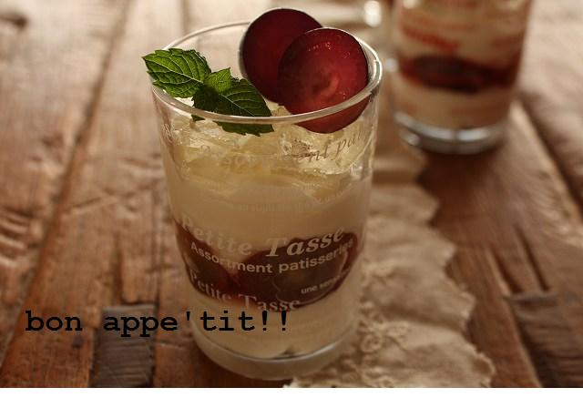 ⑨の上に残りの⑧を絞り8mm角にカットした④を上にのせる。巨峰・ミントを添える。