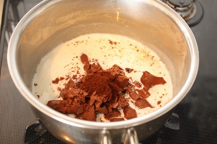 鍋に牛乳を入れて中火で沸騰直前まで温めて、細かく刻んだチョコレートとインスタントコーヒーを入れてゴムベラで混ぜながら溶かす。
