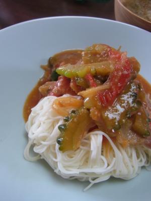 サラダ油を熱したフライパンにピーマンを入れて炒め、途中で皮をむいて、角切りにしたサツマイモと、ミートソースとカレー粉を入れ、味が絡む程度にさっと煮る。