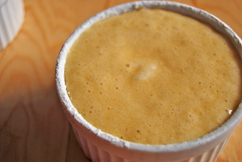 ⑦を①のココットに入れ、180~200度のオーブンで15~20分、しっかりと膨らむまで湯銭焼きにする。