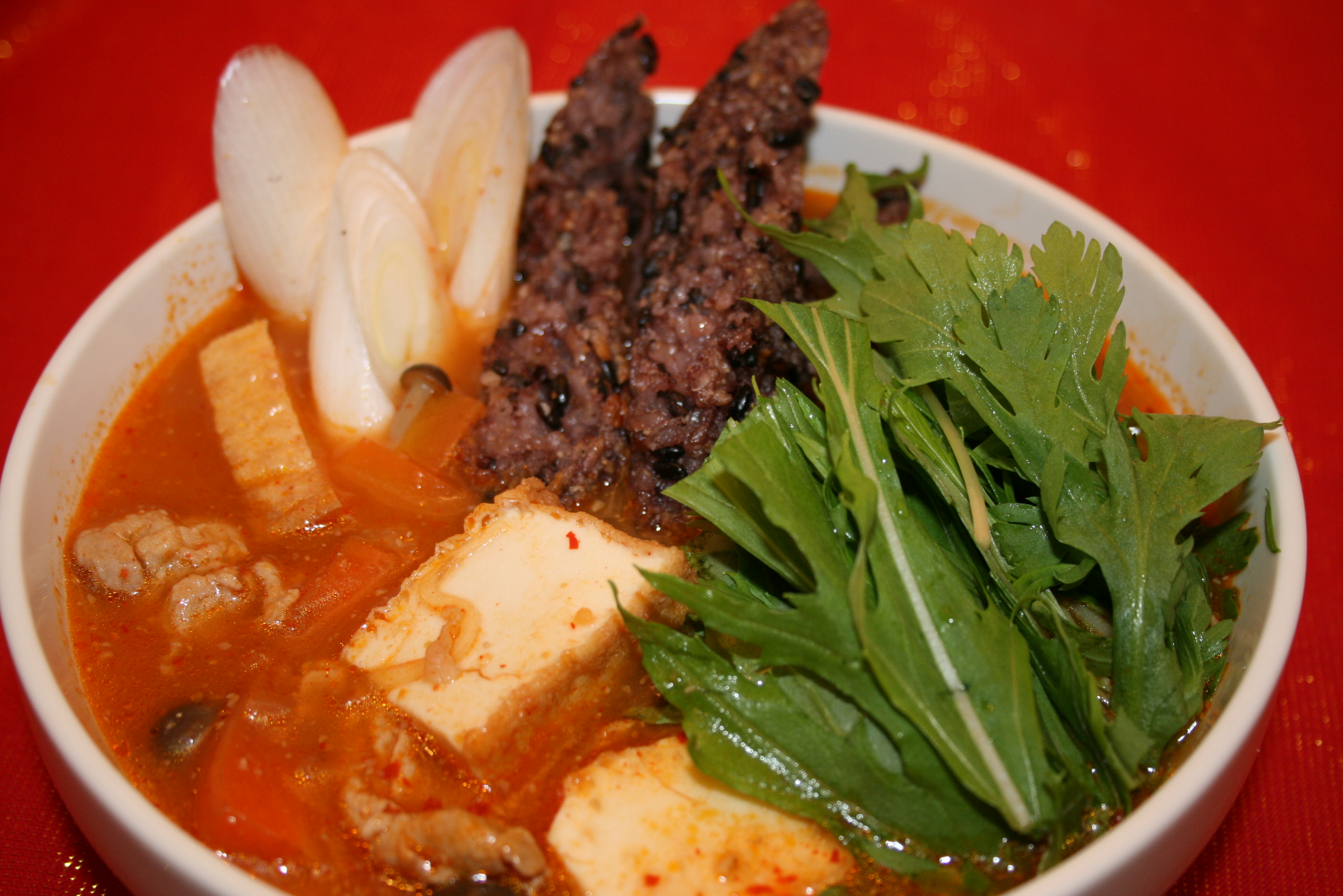 野菜とお肉、貝の旨みたっぷりのチゲ鍋に、モチモチのきりたんぽが良く合います。