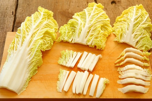 白菜は画像真ん中の線に沿って軸をきると歯ごたえがよい。葉の部分はひと口大に切る。