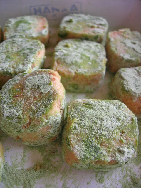 - まぶし用の和三盆に抹茶を加えて抹茶味、黄な粉を加えて黄な粉味に、とバリエーションが広がる。