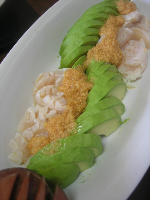 ホタテ貝柱は表面に鹿の子に切りこみを入れ熱湯でさっと湯通しし、そぎ切り。アボカドは種と皮を取り食べやすく切る。