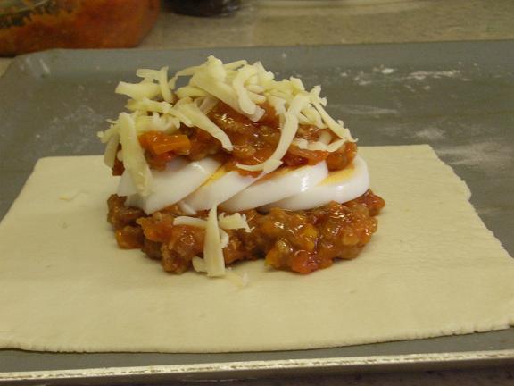 のりしろ1,5cmを残してミートソースを乗せ、ゆでたまごの輪切り、チーズ、ミートソース、チーズと重ねる。