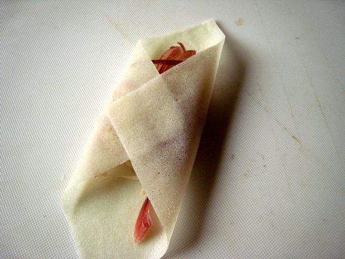 同じく春巻きの皮にみょうが少々乗せて閉じる。