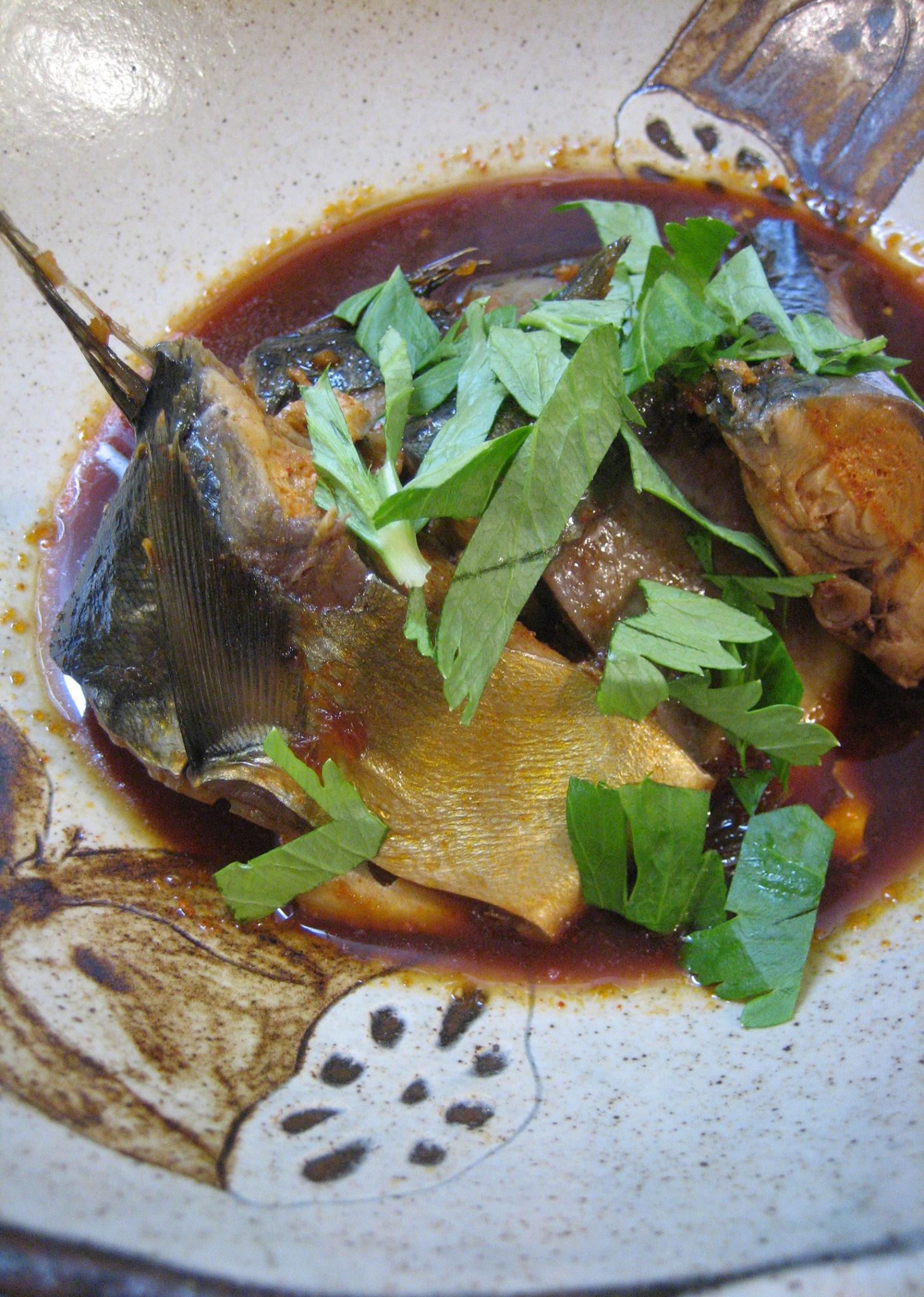 ②が沸けば、サバを加え、白ネギとパプリカを入れて火を通していく。