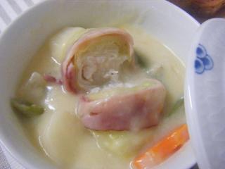 3)の上にさらにベーコンを巻いて楊枝で止め、鍋に入れ、それぞれに切った野菜も一緒に入れて中火で炒める。