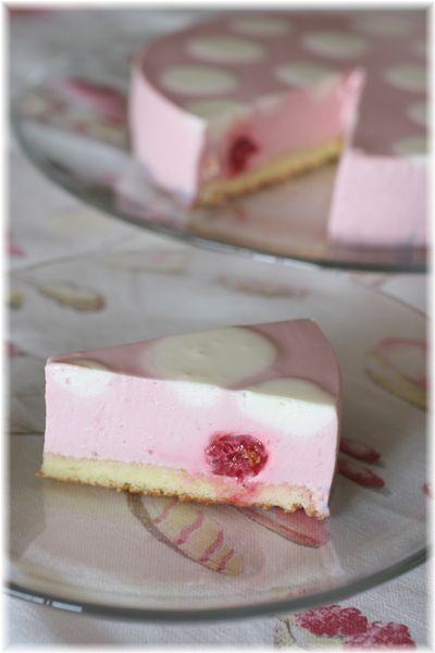 残りの生クリームと混ぜセルクル半分流しラズベリーちらしたあと残りを流す。白いクリームを所々に流し冷やす。