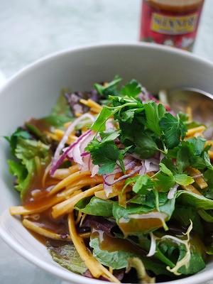 玉ねぎは、千切り、レタスは食べやすい大きさにちぎり、④と共に盛りつけ、イタリアンパセリを飾る。