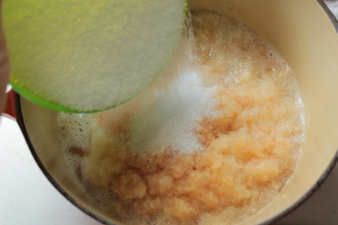 りんごをすりおろし、鍋にすりおろしたりんご、グラニュー糖を加えて中火に かける