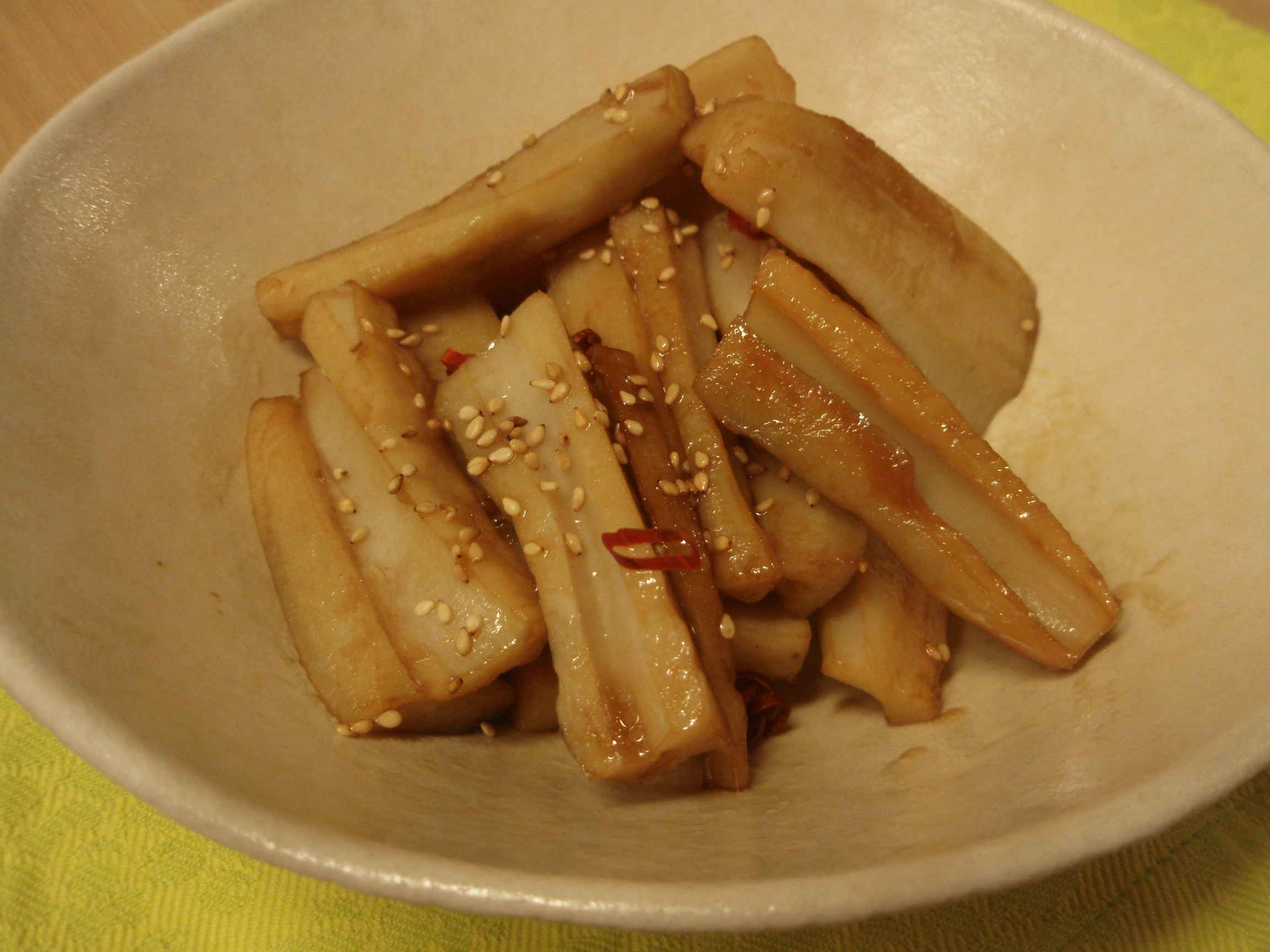 れんこんがしんなりしてきたら、赤トウガラシ・砂糖・醤油を加え、弱火にし、汁気がなくなるまで煎りつけます。