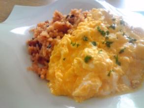 熱したフライパンにサラダ油を敷き、バターを入れてから卵を加えすばやく混ぜて半熟状になったら盛り付ける
