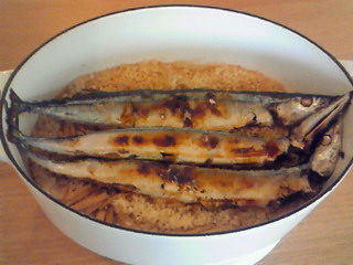 秋刀魚をほぐして器に盛り、千切り生姜と万能葱を散らす。