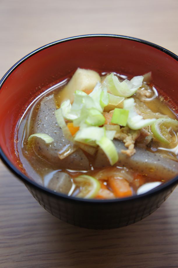 鍋に油を敷き、豚ばら肉、野菜類とこんにゃくを炒めて、だし汁を入れて10分ほどあく抜きしながら煮る。