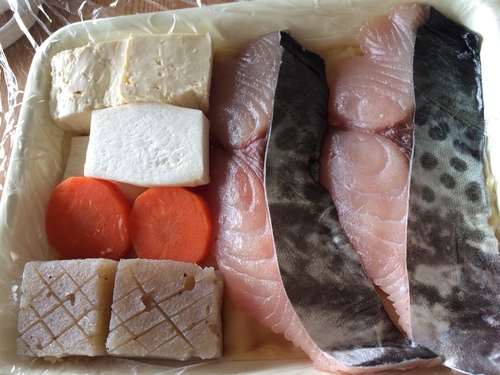 魚は表裏7対3の割合で火を通します。こんにゃく、豆腐、エリンギ、にんじんは軽く焦げ目が付くくらい。