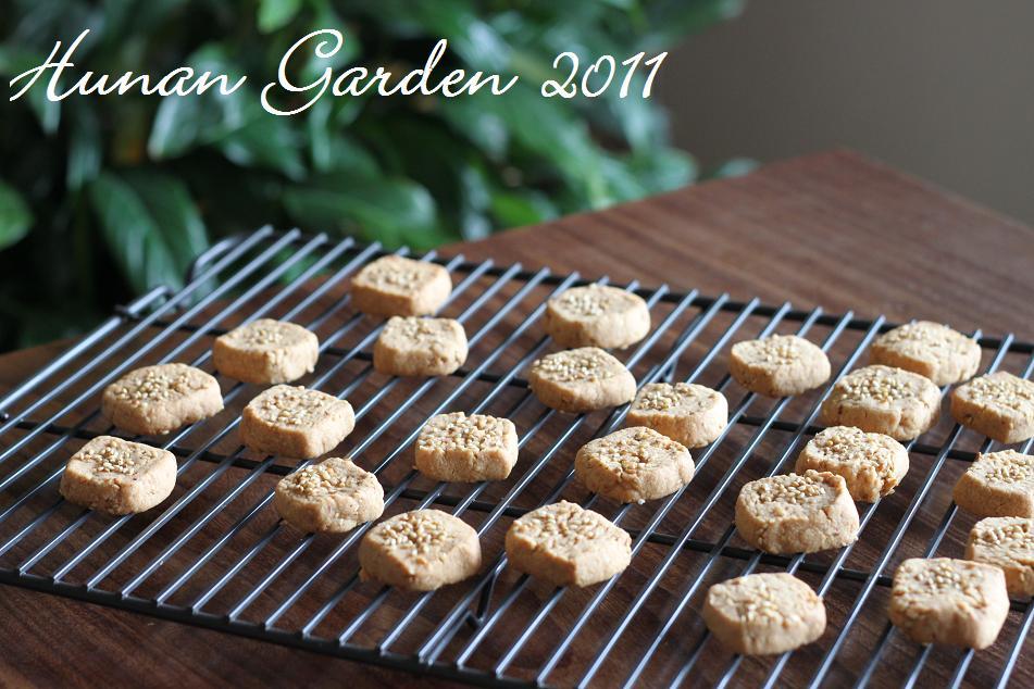 8㎜幅に切り、形を整え、オーブン皿に並べ、さらに炒り胡麻を飾る。