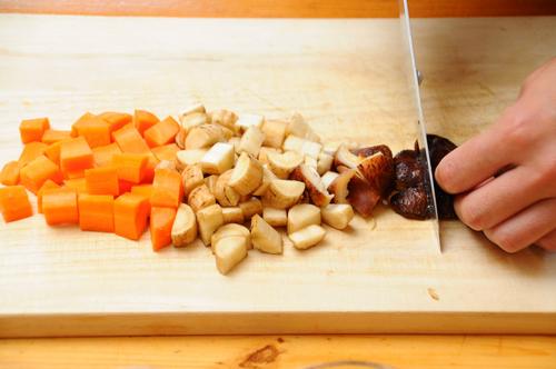 にんじん、ごぼう、戻した椎茸を1センチ角にカットします。