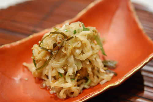 ③にツナ缶、塩、ごま油を加え、手で和えたら、皿に盛り付け、青ネギを散らす。