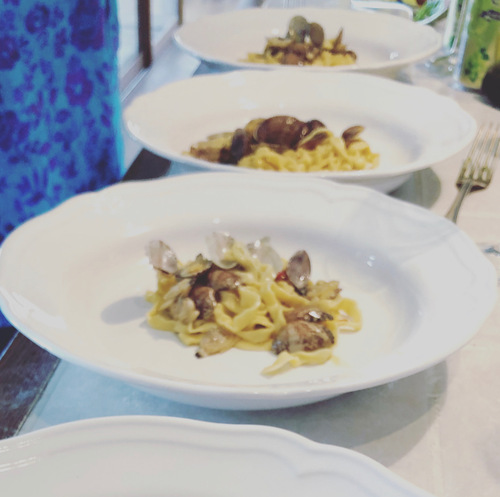 ボンゴレなど火を通してから絡ませる具材は、茹で上がる少し前にフライパンで調理して鍋から直接パスタを投入する ラザーニアの場合は生地を一度軽く湯がいて材料と組み合わせる