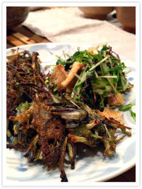 ご飯とお味噌汁、ふりかけはいつものメニューです。今夜はおいしい水菜が手に入ったので、水菜とひじきのかき揚げ、余った水菜でサラダを添えて。